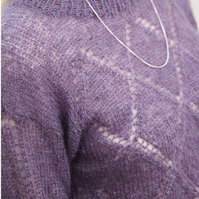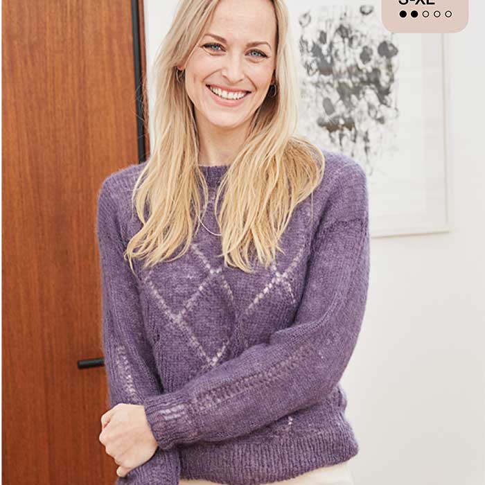 Hulmønster sweater strikket på rundpind og deles ved ærmegabet. Foran og bagpå er der hulmønster borter af harlekinfirkanter. I begge sidesømme og på ærmets overside strikkes et hulmønsterpanel. Skulderen strikkes sammen. Forneden på krop og ærmer er der rib. Hulmønstersweateren er strikket i det lækre Silk Mohair fra Sandnes garn. Pdf opskriften er på både Dansk og Svensk.