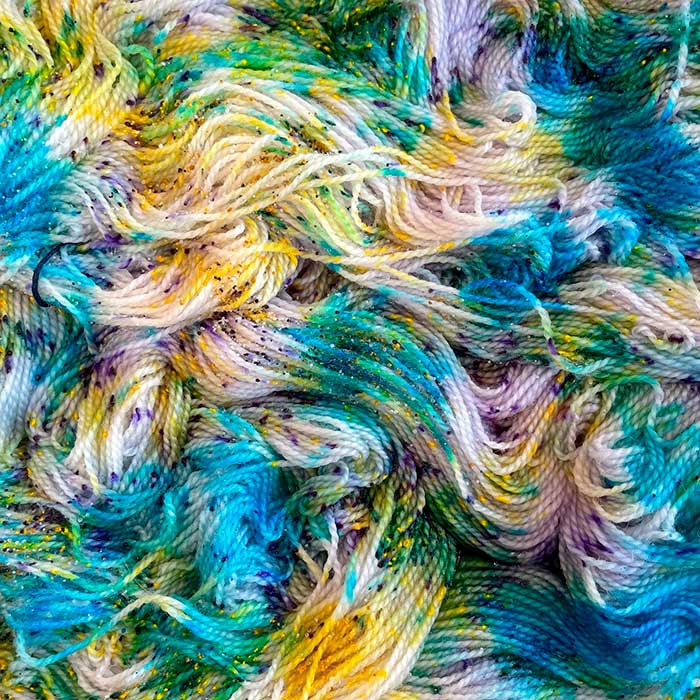 Du lærer at farve uld i en gryde og at farve de spændende speklede og multifarvede garner. Det foregår typisk på bakker og i bradepander, hvor farvestofferne masseres ind i garnerne. Samme teknik bruges, når vi skal indfarve ‘ensfarvede’ merino garner. Med denne metode kan du farve merino ulden så den bliver meleret. Det giver et helt fantastisk liv til de ellers små kedelige, triste og meget ensfarvede merino uldgarner, der kan købes. Her bliver farven mere intens, fordi den pludselig får liv.