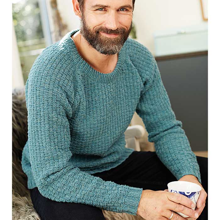 Strikket herre sweater er strikket i et strukturmønster, strikkes på rundpind og deles ved ærmegabet. Mens kroppens m hviler, strikkes ærmerne. Herefter samles forstykke, ærme, bagstykke og ærme. Bærestykket strikkes med raglanærmer. Forneden på krop og ærmer er der ribkanter. Opskriften er lavet i 5 størrelser og er for den øvede strikker.