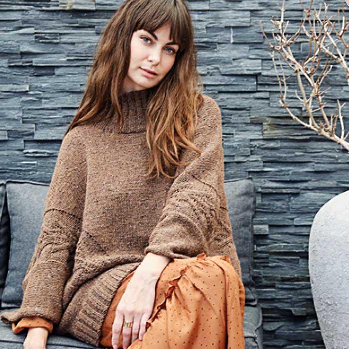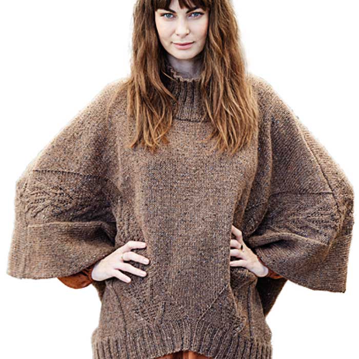 Strikket poncho med snoningerstrikkes nedefra og op. Vidden i ponchoen opstår ved at der midtfor på ponchoen laves udtagninger. Snonings panellet er stationær gennem hele arbejdet. Ponchoen er vildt lækker og dejlig varm at have på. Den er designet til hverdags brug og lige til at hoppe i når det bliver koldt. Den er strikket i Loden garn. I alle kanter er der en 2/2 rib. Opskriften er gennemarbejdet, i 4 størrelser og for den let øvede strikker.