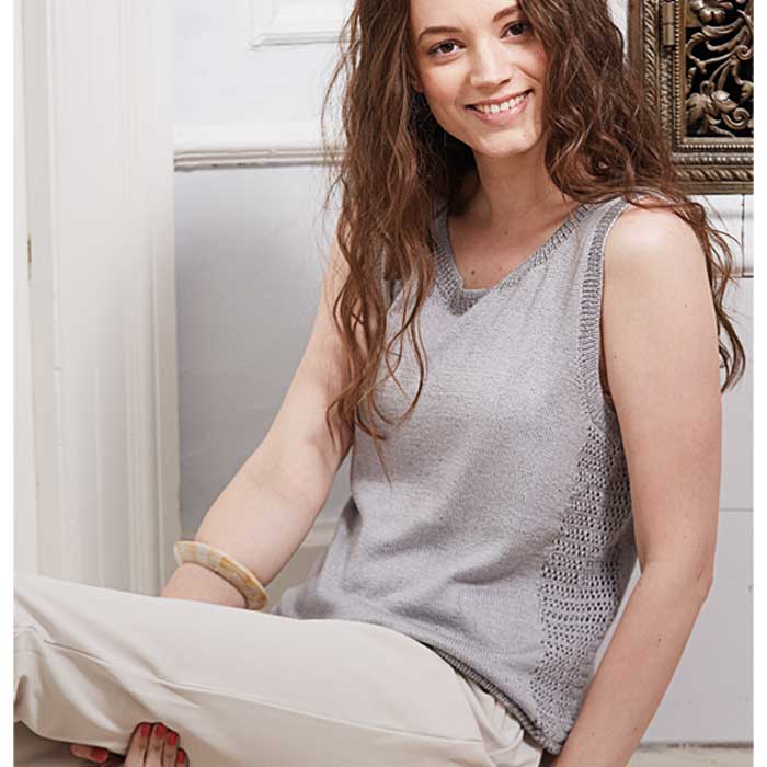 Strikket top. Toppen er strikket i glatstrikning på rundpind og med en bort i hulmønster langs side sømmen. I alle kanter er der rib. Sommer toppen er strikket i det skønne Jaipur silk kvalitet, som aldrig føles hverken for varm eller for kold.