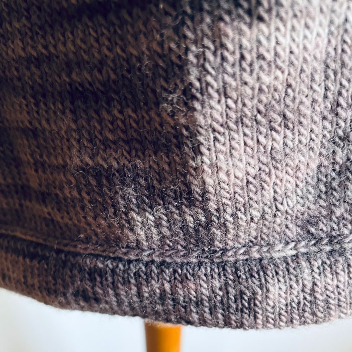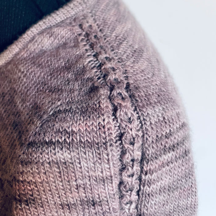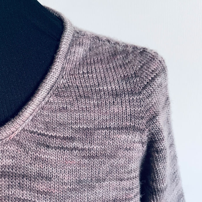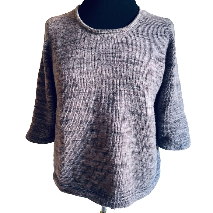 T-shirt strikkes i glatstrikning oppefra og ned efter continuous metoden. Det betyder hele modellen strikkes i et stykke og der ingen montering er. Skuldrene er skrå. Langs skuldrene og ned midtfor på de albue lange ærmer strikkes et lille snoningsmønster. Det samme snoningsmønster strikkes i hver sidesøm. I halskanten strikkes en bukkekant med vandrette masker. Ligeledes strikkes der en omgang med vandrette masker + et ombuk på ærmerne og forneden på modellen. Modellen er strikket i et vidunderligt håndfarvet garn. Garnkvaliteten kan sagtens laves om til et tilsvarende.